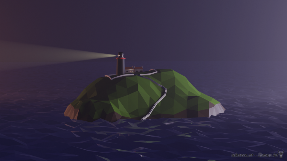 Low-poly interpretation of the Ballycotton lighthouse island in a foggy night, available in original and wallpaper resolutions.